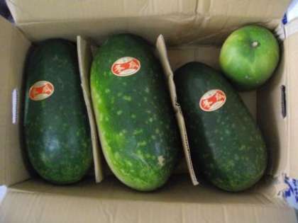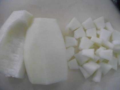 くずひきに使われたとうがんは,漢字で「冬瓜」と書きますが,7〜8月に収穫される夏の野菜です。今日のとうがんは,岡山産で,大きいもので長さがおよそ30センチ。皮をむいてわたをとり,いちょう切りにしました。つるりとした舌ざわりで,暑い夏でも食べやすい汁物です。