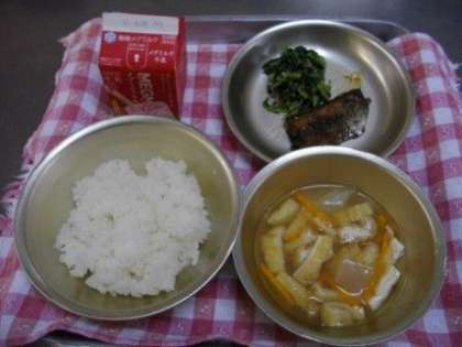 今日の献立は,「ごはん,牛乳,さんまのかわり煮,だいこん葉のごまいため,とうがんのくずひき」でした。