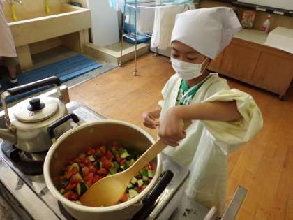 5月から大事に育ててきたなす・トマト・ピーマン・きゅうり・ズッキーニを収穫してラタトゥユを作りました。とってもきれいな野菜がたくさん!調理開始です。
