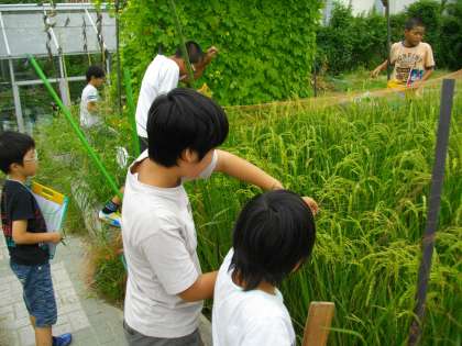 稲がすくすくと育っています。丈が90cm〜1mほどになっています。中には,少し茶色・白色になっている稲穂や葉があって,農家の方のお話のもとにそれは取り除いています。