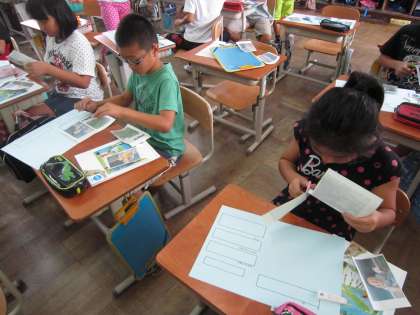 図工の学習では,紙ねんどで小人をつくりました。そして,その小人を写真で撮りました。いよいよ今日は,仕上げをします。写真を貼った画用紙に小人の名前や小人の特徴を書き込んでいきました。素敵な作品ができましたね。
