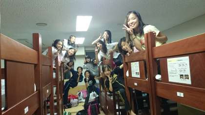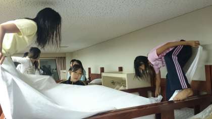次は,ふとんにシーツを敷きます。仲間と協力しながら,きれいにピシッとシーツが敷けました。寝床準備オッケーです。