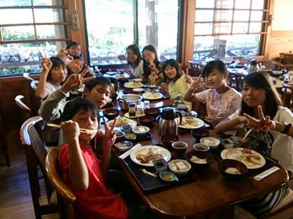 待ちに待った夕食です。今日は大冒険をしたので,お腹がいつも以上にペコペコです。夕食をした後,入浴,そして星観察があります。今日はとてもいい天気なので,今までに見たことのない星空が楽しめるのではないでしょうか?