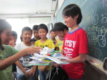 心をこめてつくったプレゼントをわたしました。たくさんのメッセージが書かれていて,とても喜んでもらえましたね。大成功!!
