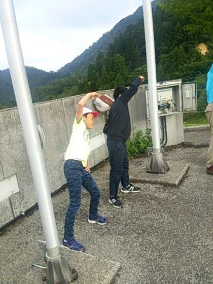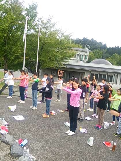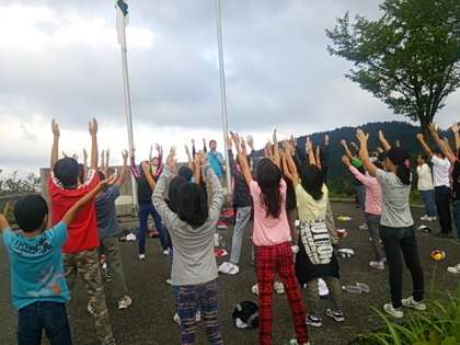 最終日の朝の集いです。いい天気の中,ラジオ体操をしています。