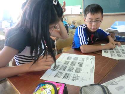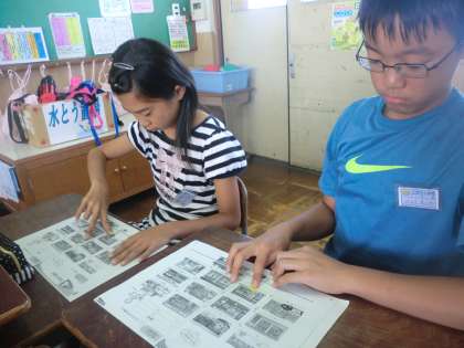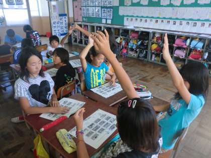 英語活動では簡単な道案内に関わる発音を学習しています。