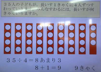 長椅子の数を求める問題で,あまった3人の子どもの分は