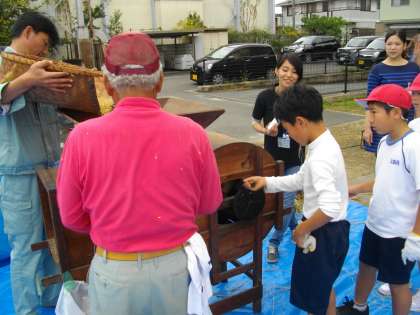 写真は唐箕の様子です。ハンドルを回して風を送り,お米とわらを分別します。昔の人の知恵に感動です。