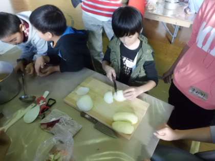 今日の夕食は,みんなで手分けをして作るカレーライス。お米を洗って,野菜を切って,火をおこして,協力し合いながら楽しく作っています。