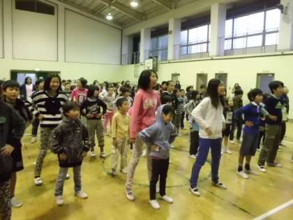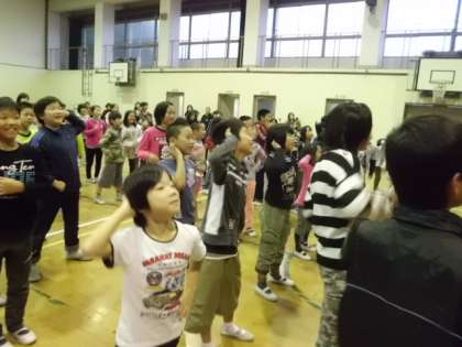 わいわい合宿2日目,朝のつどいです。学校探検の謎解きの答え合わせをした後,ネギトバちゃんと一緒に「ようかい体操第一」。みんな元気いっぱい体操していました。