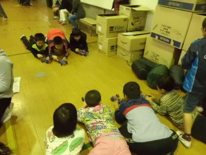 いよいよ最終メニューです,おたのしみ会その2。ゴムの力や風の力を利用して進むおもちゃの作成とゲーム大会。みんな真剣に作っています。