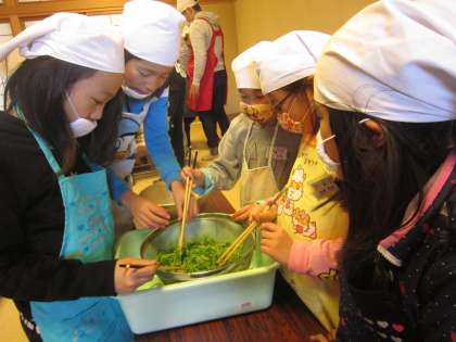 壬生菜のおひたし作りは,壬生菜を切ることから始めました。壬生菜をそろえるのが大変でしたが,上手に切ることができていましたね。そして,醤油とゴマで味付けをして完成です。おいしそう!
