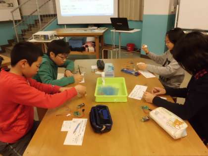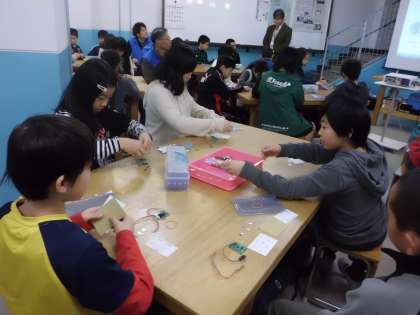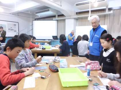 工房学習では,堀場製作所さんの「世界に一つだけの温度計」を作りました。センサーで温度を感知して,緑・黄・赤のLEDで知らせてくれます。家でもぜひ試してみてください。