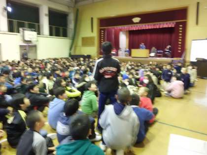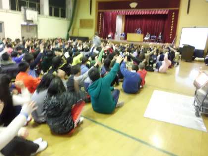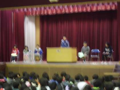 「6年生を送る会をふり返って」「来年度への決意」を各学年代表者が全校の前で発表しました。感想者やフロアの子どもたちもがんばりました。