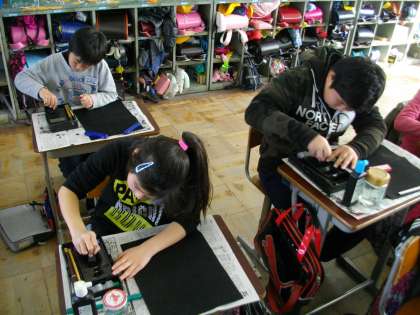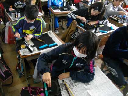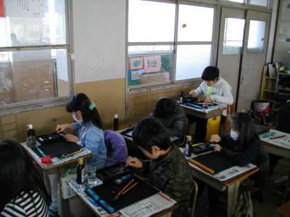 今日は,最後の習字でした。1年間の気持ちを込めてすみをすりました。