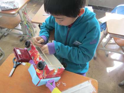 図工の学習では,ドリームカーを作成しています。自分だけの素敵な車をつくることができましたね。次は,輪ゴムと糸を使って,動く仕組みをつくっていきます。
