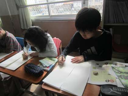 社会科の学習では,パンフレットづくりをしています。社会科で学んだ美山町のことをまとめていきます。美山町に観光客が集まる理由や特産品などをまとめていきました。写真を使ったり,キャッチフレーズを考えたりして上手につくることができましたね。
