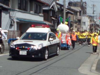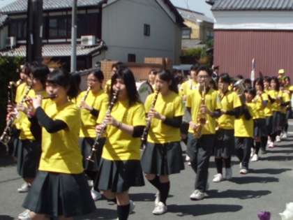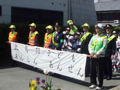 初夏のような快晴のもと,今年も「あんしん・あんぜんパレート」が行われました。今年は,上調子公園から上鳥羽小学校までのコースを,洛南中学校吹奏楽部の軽快な演奏とともに歩きました。上鳥羽のゆるキャラ『ねぎトバちゃん』もパレードに参加しれくれました。