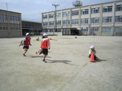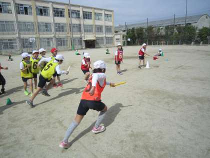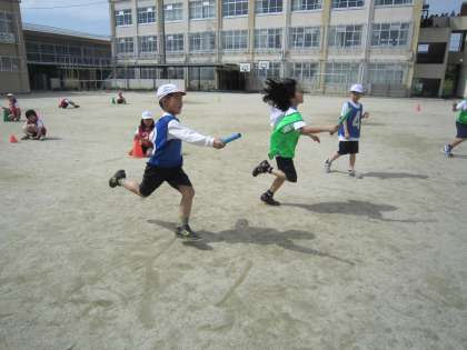 体育ではリレーをしています。チームで少しでも速く走りきれるようにいろいろな工夫をしています。バトンの渡し方や走り方を気をつけています。今日は何秒だったかな?