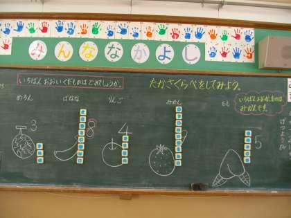 今日は,「いちばんおおいくだものはどれでしょうか。」ということを数図ブロックを使って考えました。