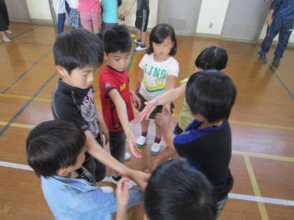 これは人間知恵の輪という協力ゲームです。みんなで協力して手を離さずに一つの円になれるかな?