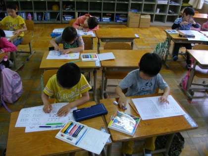 1年生にとって初めての土曜学習がありました。今までに学習した算数の内容をプリントでしました。みんな1枚でも多く,一生懸命にがんばっていましたよ。