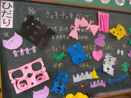 色画用紙を折ったり,重ねたり,切ったりしてかざりを作りました。子どもたちは,思い思いの作品を作って楽しみました。