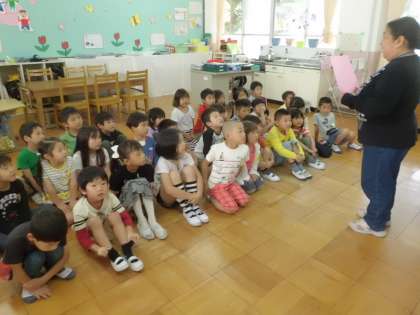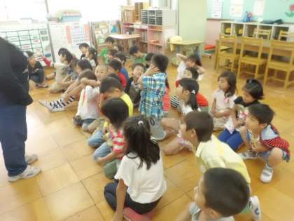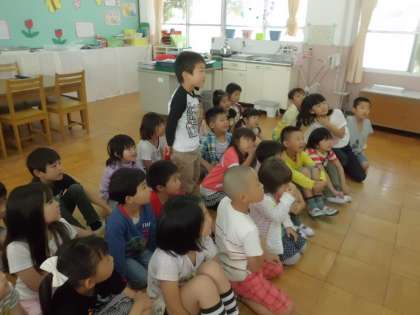 4くみの教室で,自己紹介の後,1年1組の教室との違い等を見つけました。そして,みんなで「かもつれっしゃ」をして交流しました。