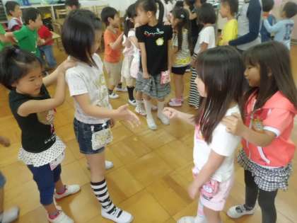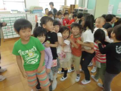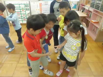 4くみの教室で,自己紹介の後,1年1組の教室との違い等を見つけました。そして,みんなで「かもつれっしゃ」をして交流しました。
