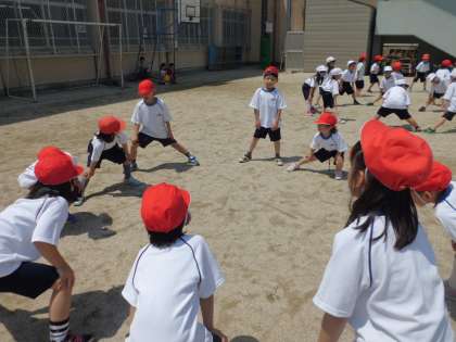 体育の準備運動をグループでしました。大きな声を出してみんなで体をほぐしました。その後のリレーではお互いに励まし合う声が多く出てきました。これからもみんなでがんばりたいです。