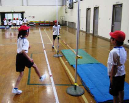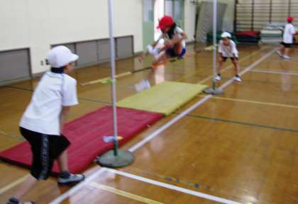 体育の学習で高跳びをしています。1・2・3でジャンプ!なかなか難しいようですが楽しみながら自分が決めた高さに向かって挑戦しています。