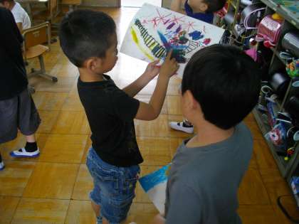 どんな絵を描いたかお友だちにお話しています。