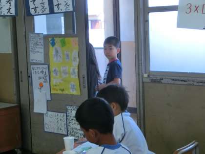 授業中,1,2年生が学校探検で教室を見に来ていました。