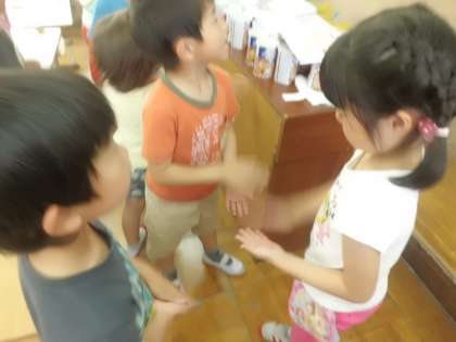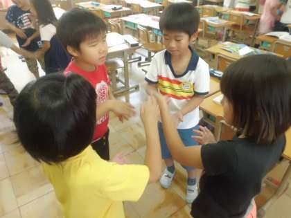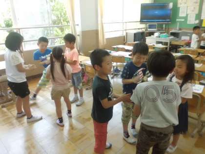 音楽ではグループで「拍」に合わせて声と手拍子を合わせました。うまく行った時はみんなうれしそうでした。