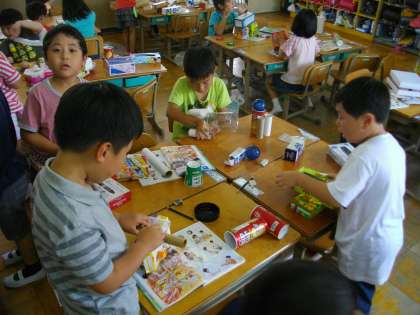 家から持ってきた箱を使ってさまざまな形づくりにチャレンジしました。みんな一生懸命でした。