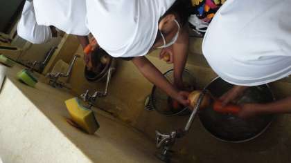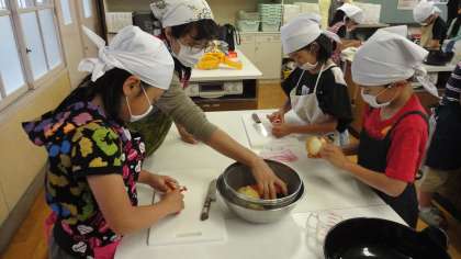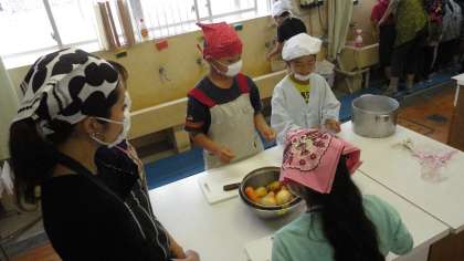 野菜づくりチームは,家庭科室で野菜を洗ったり,切ったりします。手際良くできていましたね〜