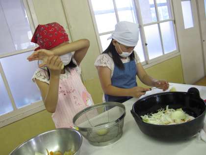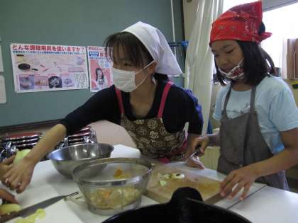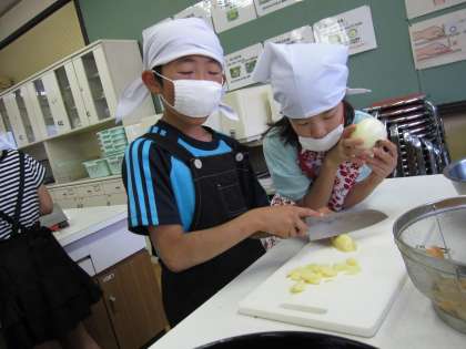 野菜係もとても頑張っていました。玉ねぎを切りながら涙を流し,「目が痛いよ。」と言いながらも最後までやり遂げていました。