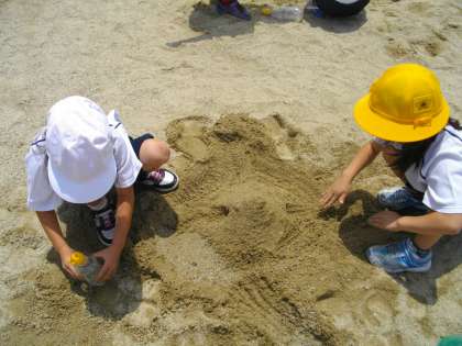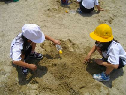 図工で,すなとつちとなかよしを学習しました。砂場で,すなやつちの感触をいっぱい感じました。「きもちいい」という声がたくさんありました。