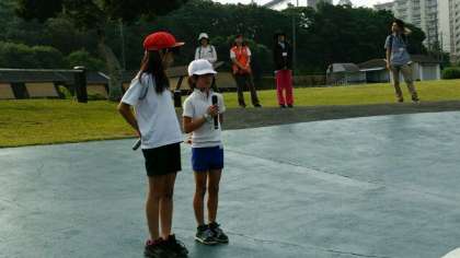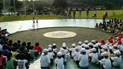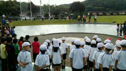 二日目の朝,朝の集いです。いい天気の中,4年生のみんな元気です。