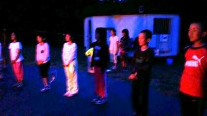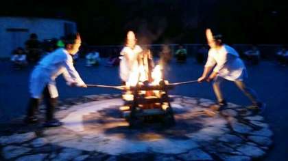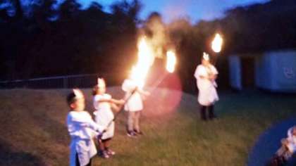 みさきの家宿泊学習のクライマックス,キャンプファイヤーの始まりです。火の神の登場,点火です。