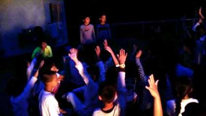 キャンプファイヤーはじょじょに盛り上がってきました。みんなで妖怪体操第一だ〜。
