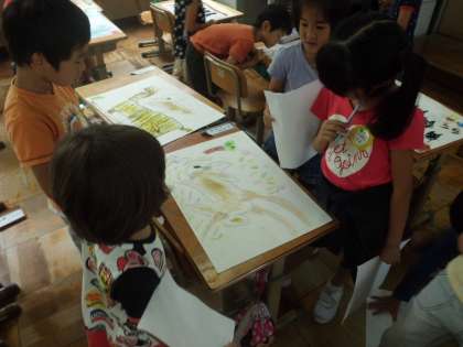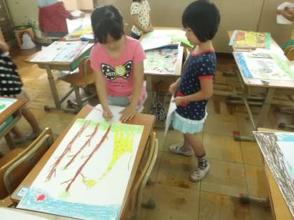 動物園の思い出を絵にかいた後,みんなの良さを見つけようと観賞会をしました。お友だちの絵を見て,次の作品作りに生かしていけるといいなと思います。