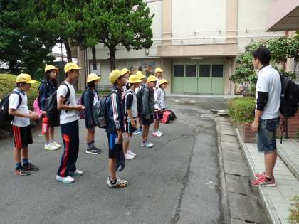 6月20日(土)は,第31回 全国小学生陸上競技交流大会京都府予選会が西京極運動公園陸上競技場で行なわれます。上鳥羽小学校からも5・6年生が出場します。今,朝のミーティングが終わり学校を出発しました。