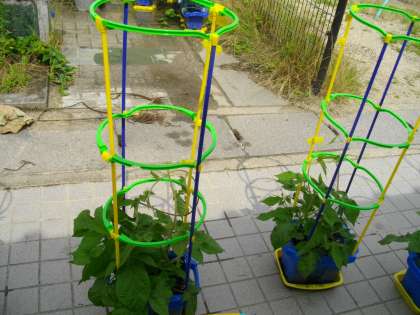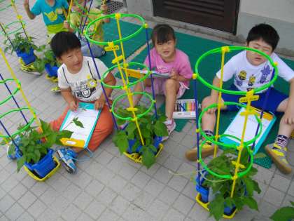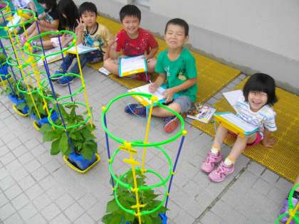 あさがおが大きく育っています。今日は,あさがおを支えるための支柱を立てました。