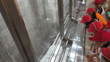 ごみクレーンの迫力に驚く子どもたち。運ばれてきたたくさんのごみはごみクレーンで細かくされてるんですね。