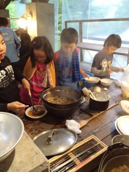 みんなの協力でおいしそうな夕食の完成です。さあ,盛りつけていただきましょう。