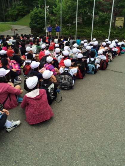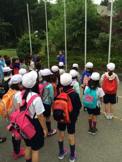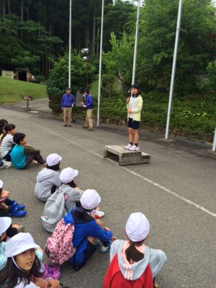 山の家2日目のスタートです。朝の集いを玄関前ので行いました。現在利用している3小学校合同です。上鳥羽小からも代表者による学校紹介を行いました。緊張感のある中,練習の成果が出せて良かったです。