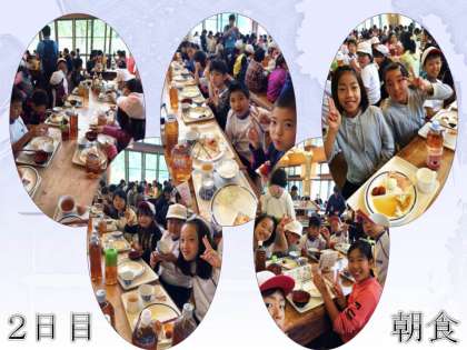 朝のつどいが終わり,おなかがすいてきました。今日一日,元気よく過ごすためにしっかり朝食をいただきます。朝からバイキングのメニューです。パン食でもご飯食でも,お好きな方をどうぞ。「いただきます!」