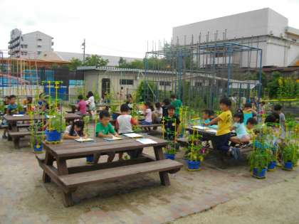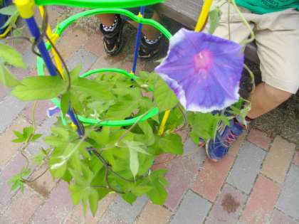 生活科の学習であさがおを育てています。最近になって次々ときれいに開花しています。今日は,巻きついたつるの修正をした後,観察日記を書きました。