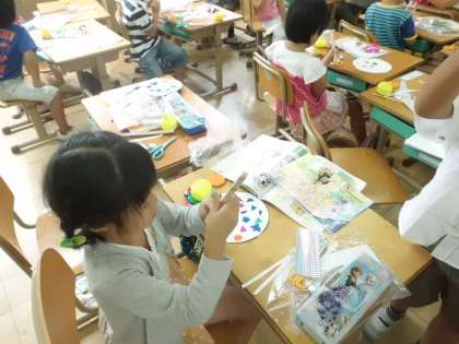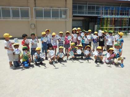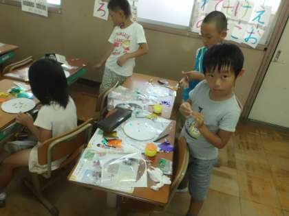 図工で「くるくるまわして」で風でくるくる回る作品を作りました。キラキラの紙をたくさん貼り,完成を楽しみにしながら作りました。